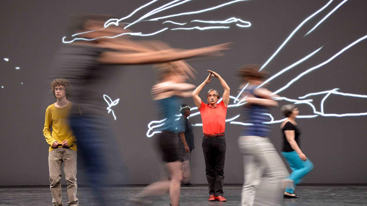 Choreographer Mathilde Monnier and illustrator François Olislaeger’s piece, Qu’est-ce qui nous arrive ?!?, blends drawing with dance. Twenty men and women with no prior stage experience tap into their memories: whether at clubs, parties or school discos, they have all danced before at some time or another. These suspended moments are brought to life by a parade of speech bubbles drawn by Olislaeger, who projects silhouettes and bodies on the stage’s backdrop in a live exploration of the pictorial gesture.